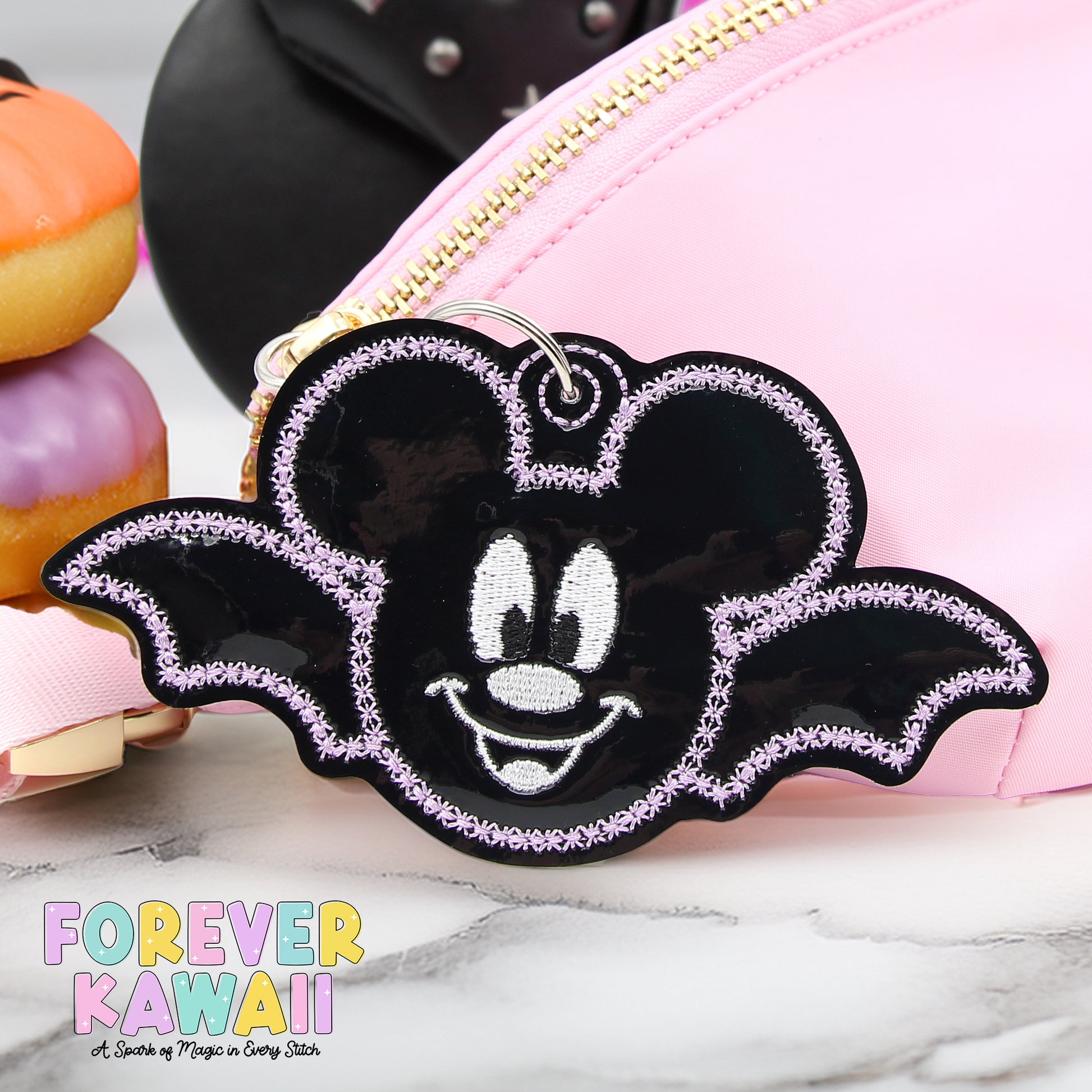 Shiny Black Bat Mouse Bag Charm – Halloween Vinyl Keychain with Lavender Stitching